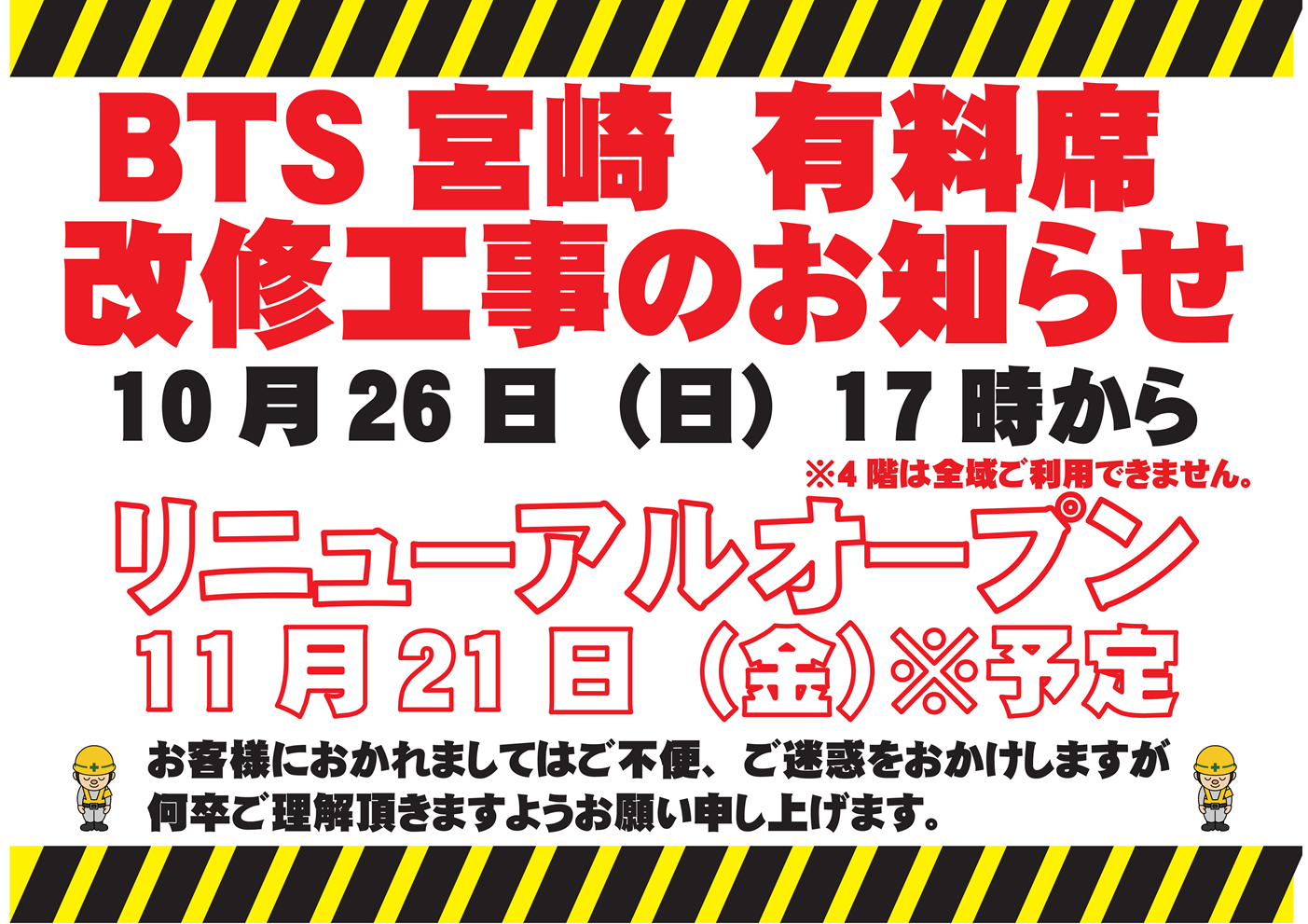 尚、一般席エリアは通常営業を続けますので引き続きBTS宮崎へのご来場よろしくお願いいたします。