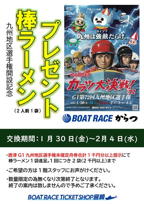 1月30日(金)からBRからつ『G1九州地区選手権』開催記念として棒ラーメンをプレゼント!