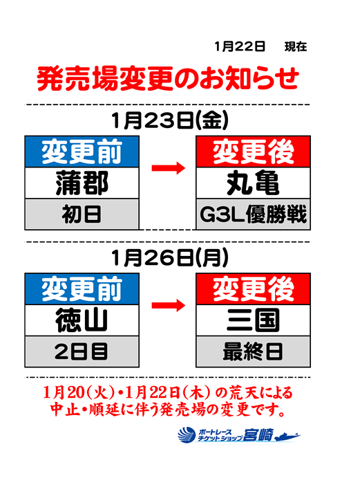 発売場変更のお知らせ※1/23(金)1/26(月) 荒天による中止・順延に伴う発売場の変更をお知らせいたします。 変更日と発売場につきましては画像にて御確認ください。 2026/01/22 BTS 宮崎
