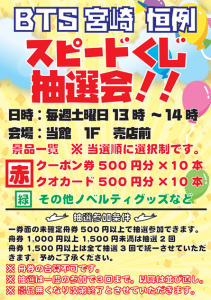 毎週土曜日恒例!スピードくじ抽選会開催!13時から14時※景品無くなり次第終了