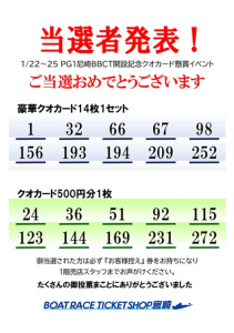 1/22~25に開催されましたPG1尼崎BBTC開設記念【豪華クオカードプレゼント】イベントの当選者発表です。当選番号は画像にて御確認下さい。たくさんの御参加誠にありがとうございます。 -